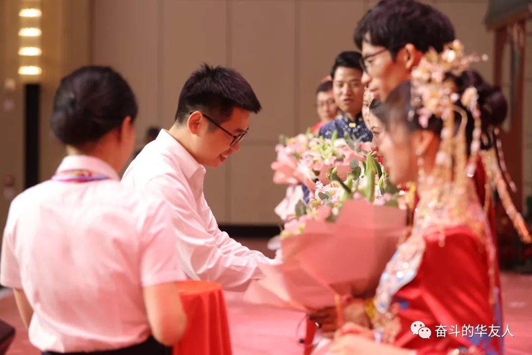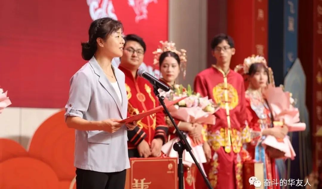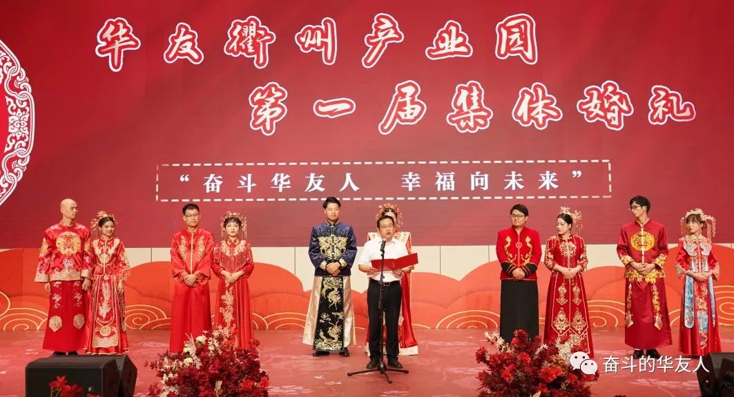In the midst of the event, Fang Yuan, Vice President of the Group and Party Secretary of Huayou Quzhou Industrial Park, officiates the wedding ceremony, invoking blessings for a beautiful life ahead. Li Tiancheng, Assistant to the Group President and Vice President of New Energy Industrial Group, presents flowers, extending wishes for a century of happiness. Xu Wei, Vice President of the Group and President of the New Materials Industrial Group, conveys the company's well-wishing by offering red envelopes filled with blessings, wishing harmonious and melodious lives for the couples. Lu Ximing, Chairman of the Huayou Quzhou Industrial Park Workers' Union, offers a gift on behalf of the union, hoping for enduring happiness. Tong Zhou, Secretary of the Quzhou Municipal Committee of the Communist Youth League, delivers a congratulatory speech, extending wishes for a lifetime filled with love.