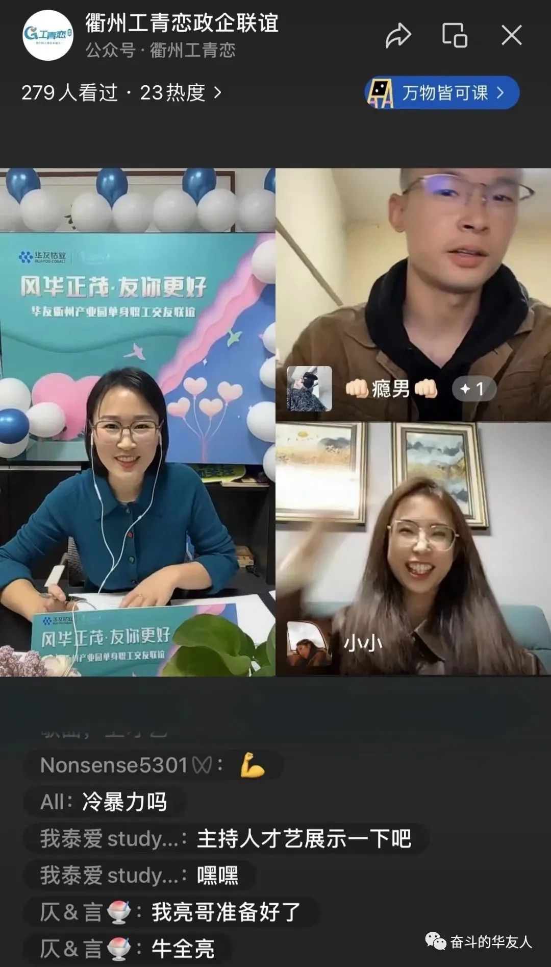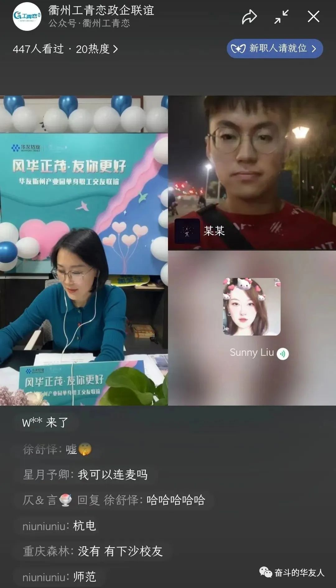 On October 29th, at 7:00 PM, the online romantic streaming event titled 'Fate Brought You' commenced with an enthusiastic participation of over 200 single men and women. Hosted interactively, featuring profiles, online connections, and more, the event offered a refreshing approach to self-expression, paving the way for novel connections. By integrating live streaming, sentiment exchange, friend requests, group chats, and the captivating 'Chance Encounter' wall, further communication blossomed among peers, attracting a cumulative participation of over 490 by the event's conclusion. This effectively surmounted barriers such as time, distance, and location that often hindered the forging of friendships.