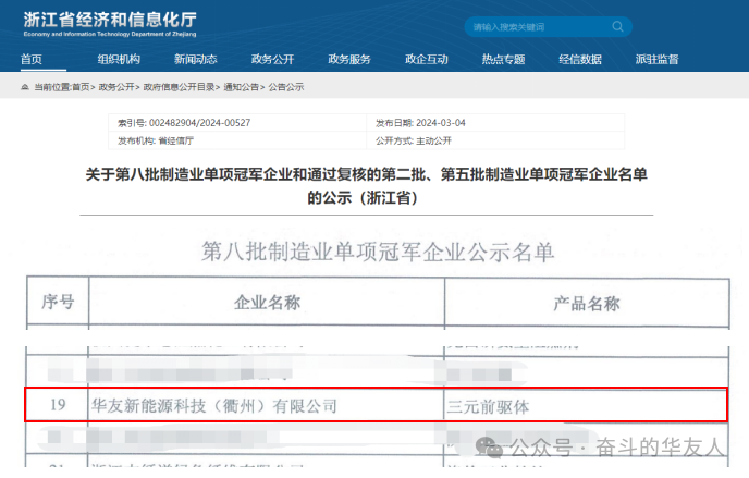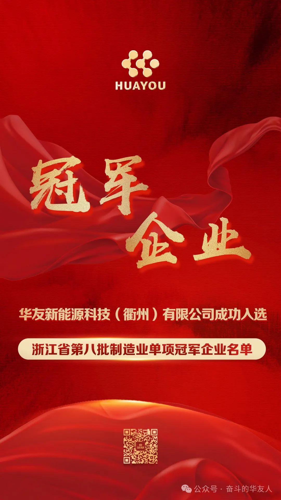 Recently, Huayou New Energy Technology (Quzhou) Co., Ltd. (hereinafter referred to as "Huayou New Energy Quzhou") was successfully listed in the eighth batch of manufacturing single champion enterprises, showcasing its exceptional technological innovation ability and market leadership in the new energy lithium battery material domain.