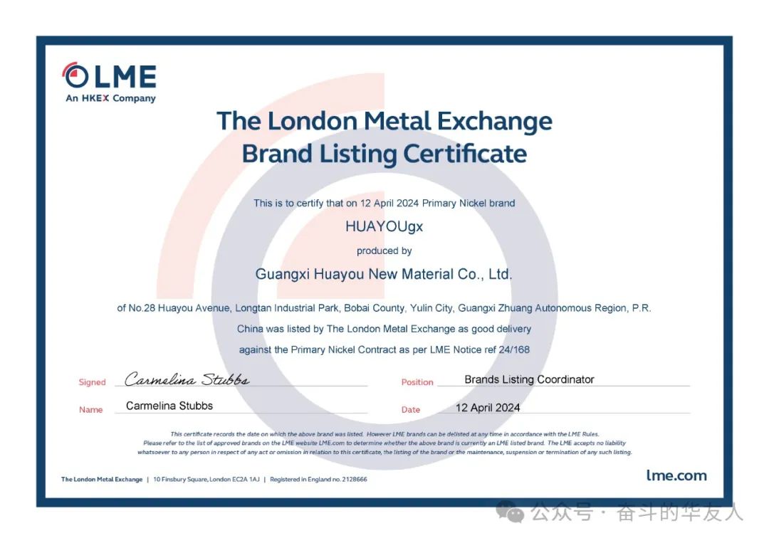Another symbolic achievement! Successful Registration of "HUAYOUgx" Brand Electrolytic Nickel on LME