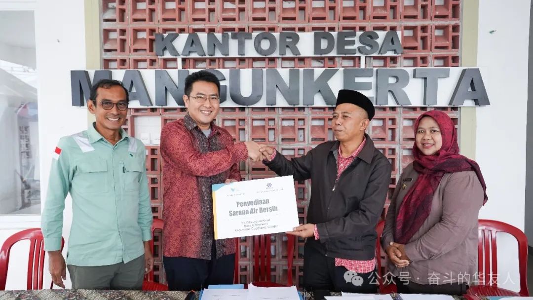 Recently, Huayou and Vale Indonesia held a handover ceremony for the first phase of the water supply project in Mangunkerta Village Office, Gianzhu City, West Java Province. During the ceremony, Adriansyah Chaniago, Vice President of Vale Indonesia, and Zhen Delong, Head of Public Affairs of Huayou Indonesia, presented donation certificates to Asep Nahdoh, Head of Cibeureum Village, and Ira, Head of Mangunkerta Village.