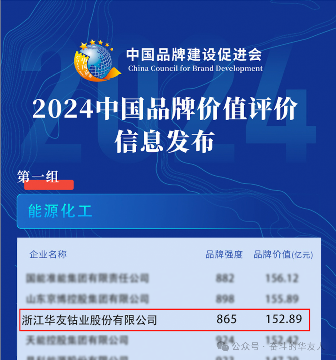 On 11th May, Xinhua News Agency, China Brand Building Promotion Association and China Asset Appraisal Association jointly released the "2024 China Brand Value Evaluation Information" in Deqing, Zhejiang Province. The brand value of Huayou Cobalt reached 15.289 billion yuan, with a brand strength of 865, standing out among more than 1,000 brands.
