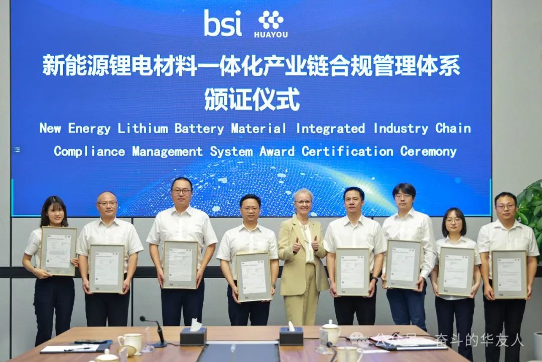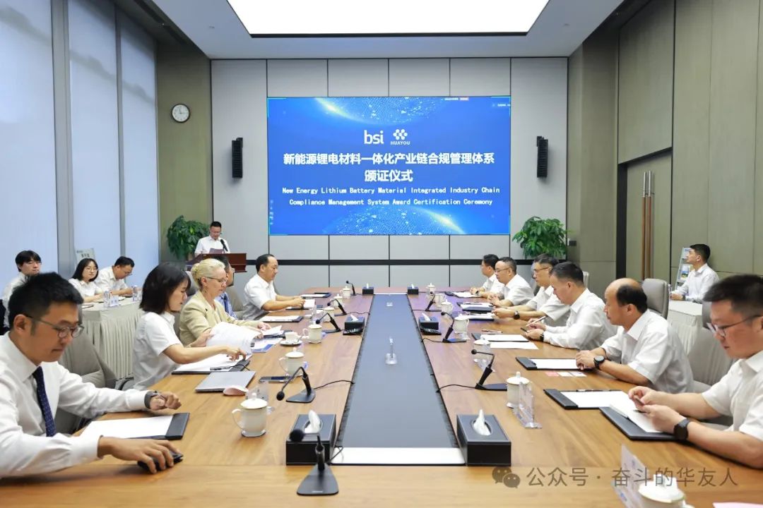 The ceremony for the certification of Huayou Cobalt's integrated compliance management system for new energy lithium materials was held during the meeting. Seven subsidiaries of Huayou, both domestic and overseas, officially received the BSI ISO 37301:2021 and GB/T35770-2022 certification certificates, making them the world's first (both domestically and internationally) certified new energy lithium material enterprises. The seven subsidiaries are: Prospect Lithium Zimbabwe (Private) Limited, Huayue Nickel Cobalt (Indonesia) Co., Ltd., Quzhou Huayou Cobalt New Material Co., Ltd., Huayou New Energy Technology (Quzhou) Co., Ltd., Guangxi Huayou Lithium Industry Co., Ltd., Quzhou Huayou Resource Recycling Technology Co., Ltd., and Zhejiang Huayou Circular Technology Co., Ltd.