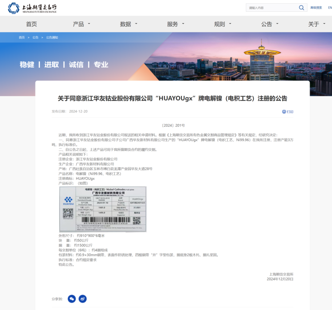 On December 20th, the "HUAYOUgx" brand electrolytic nickel (electro-winning process, Ni99.96) produced by Guangxi Huayou New Materials Co., Ltd., a subsidiary of Huayou Cobalt, was successfully registered on the Shanghai Futures Exchange (SHFE). The registered production capacity is 30,000 tons.
