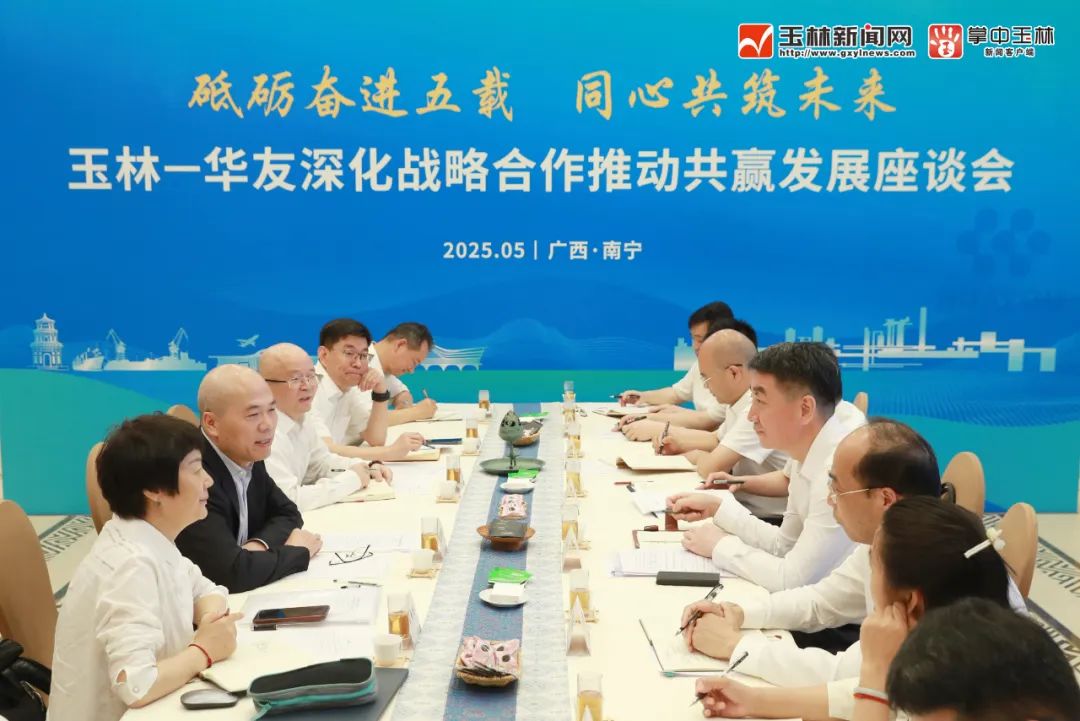 On May 9th, the symposium titled "Five Years of Hard Work, Joining Hands to Build the Future: Deepening Strategic Cooperation and Promoting Win-Win Development" was held in Nanning. Yulin's Party Secretary Wang Chen and Mayor Zhang Huiqiang met with Chairman Chen Xuehua of Huayou Holding Group, who is also an Honorary Citizen of Yulin City, along with his delegation, to discuss cooperation and development.