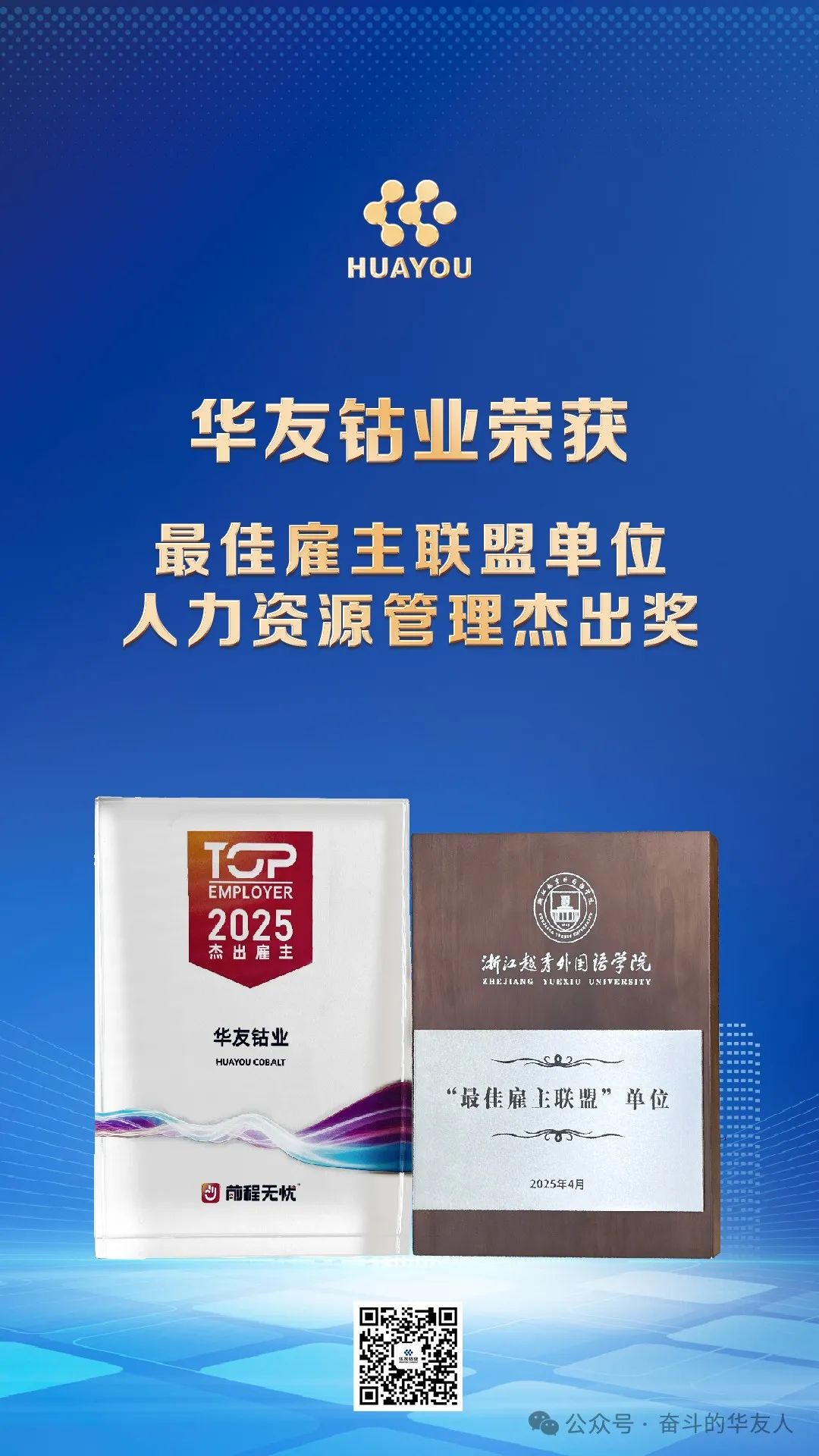 4月,華友鈷業(yè)憑借在人力資源領(lǐng)域的突破性探索與產(chǎn)教融合的標(biāo)桿實(shí)踐,蟬聯(lián)兩項(xiàng)雇主榮譽(yù)——前程無(wú)憂(yōu)"2025人力資源管理杰出獎(jiǎng)"與浙江越秀外國(guó)語(yǔ)學(xué)院"最佳雇主聯(lián)盟"單位!這不僅是對(duì)公司“以人為本”核心價(jià)值的深度認(rèn)可,更彰顯了華友鈷業(yè)以數(shù)字化革新組織生態(tài)、以校企協(xié)同培育全球競(jìng)爭(zhēng)力的人才戰(zhàn)略格局。