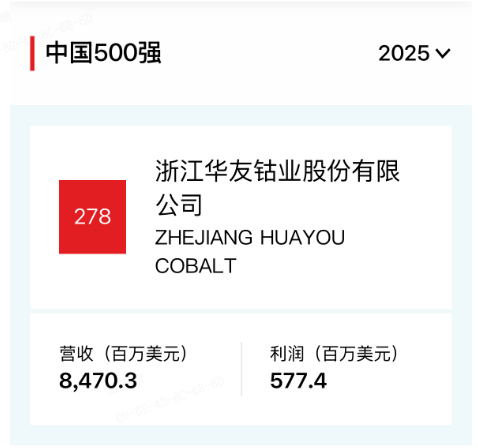 On July 22, The 2025 Fortune China 500 ranking was released today, with Huayou Cobalt (603799.SH) securing the 278th position with $8.47 billion in revenue (RMB 59.99 billion) in 2024, climbing two places from the previous year.