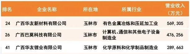 廣西制造業(yè)民營(yíng)qm球盟會(huì)·(中國(guó))球盟會(huì)100強(qiáng)榜單中,廣西華友新材料有限公司位列第24名,廣西巴莫科技有限公司排名第26位,廣西華友鋰業(yè)有限公司位居第41名。