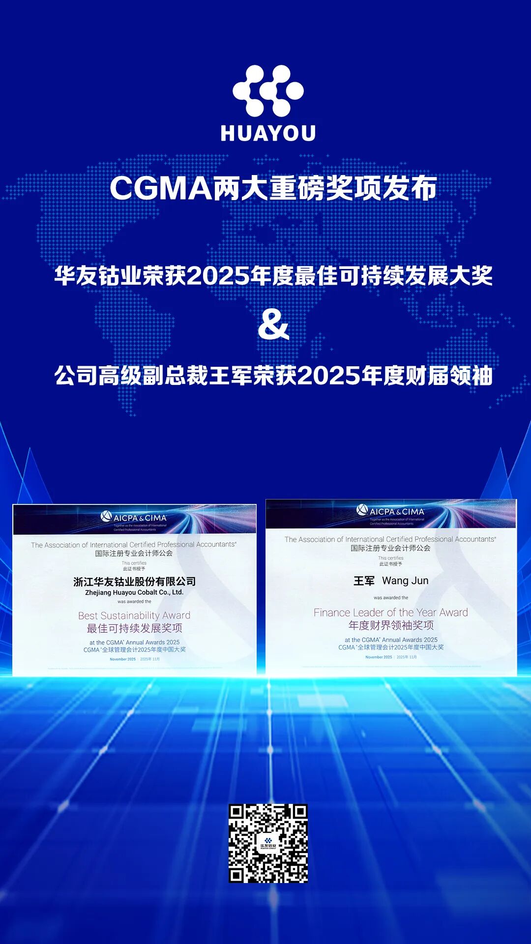11月26日,被譽(yù)為“財(cái)界奧斯卡”的CGMA全球管理會(huì)計(jì)2025年度中國大獎(jiǎng)暨CFO高峰論壇在上海圓滿落幕。華友鈷業(yè)在盛會(huì)中一舉摘得“年度財(cái)界領(lǐng)袖”與“最佳可持續(xù)發(fā)展獎(jiǎng)”兩項(xiàng)重量級大獎(jiǎng),充分彰顯了其在財(cái)務(wù)治理與可持續(xù)發(fā)展領(lǐng)域的行業(yè)領(lǐng)先地位。