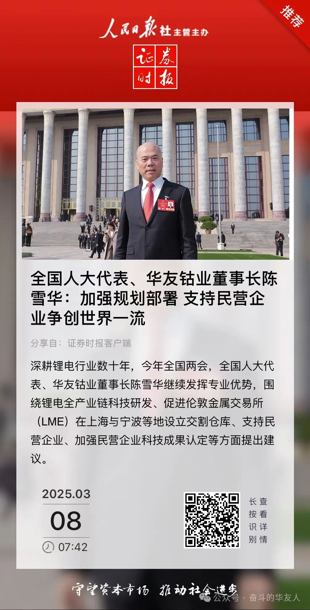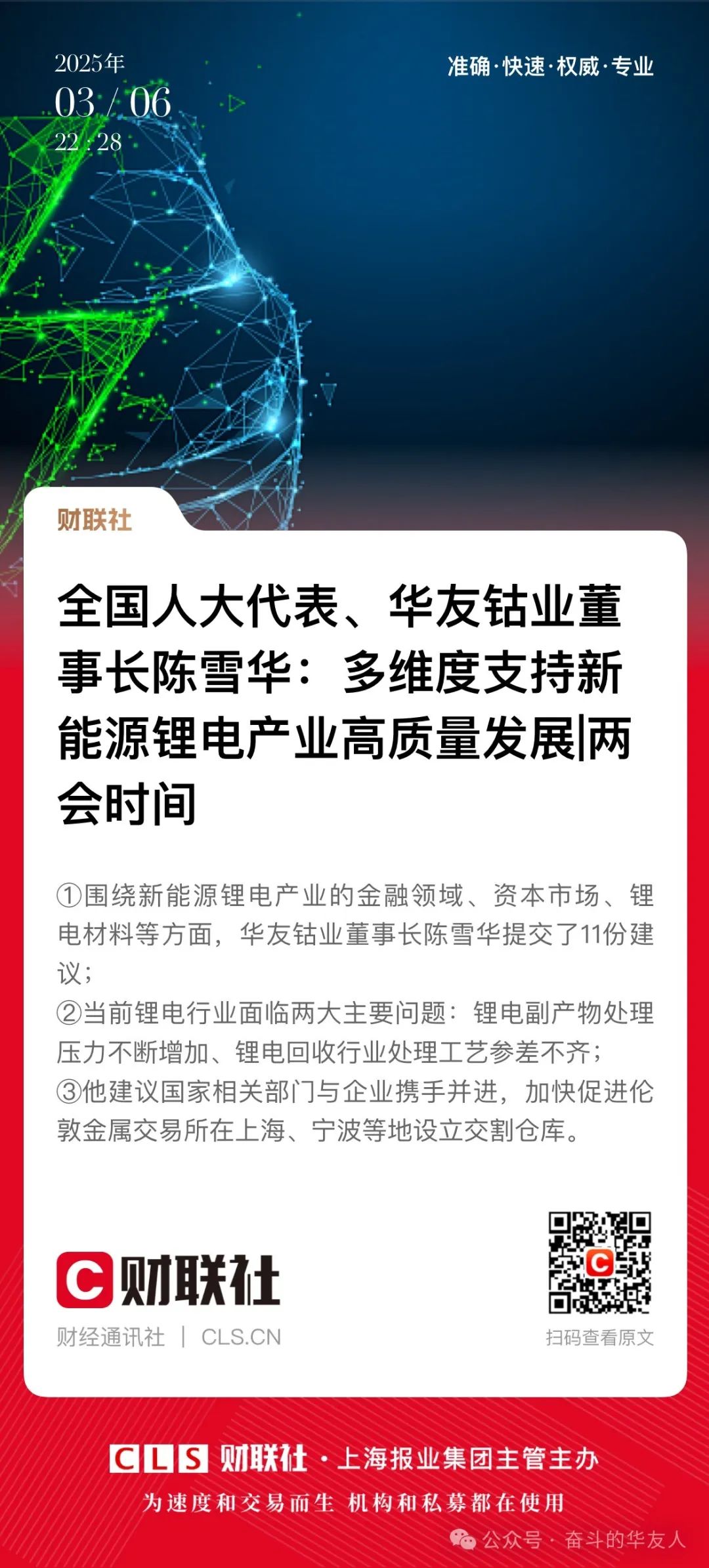 3月6日,財(cái)聯(lián)社刊發(fā)了《全國(guó)人大代表、華友鈷業(yè)董事長(zhǎng)陳雪華:多維度支持新能源鋰電產(chǎn)業(yè)高質(zhì)量發(fā)展》的文章。圍繞新能源鋰電產(chǎn)業(yè)的金融領(lǐng)域、資本市場(chǎng)、鋰電材料等方面,陳雪華代表提交了11份建議