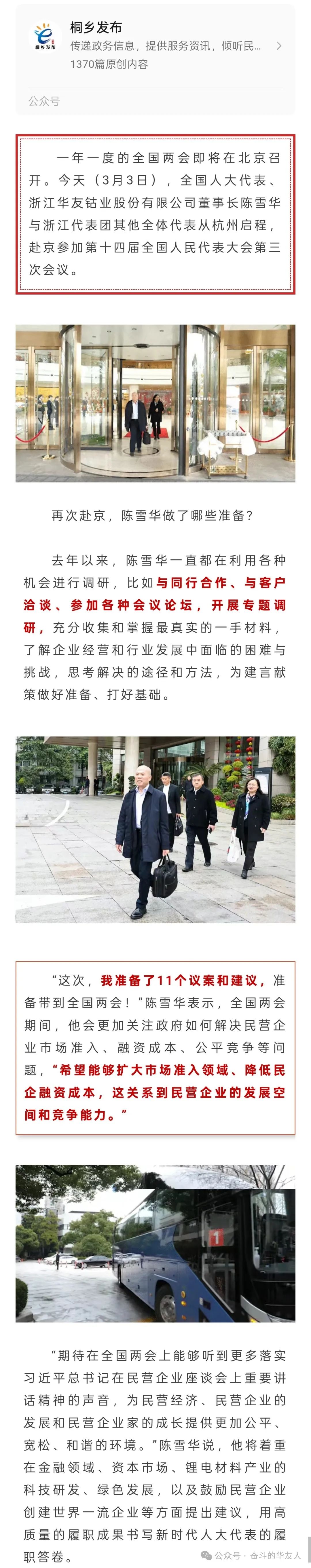 3月3日,陳雪華董事長(zhǎng)啟程參加全國(guó)兩會(huì),桐鄉(xiāng)發(fā)布刊發(fā)《今天啟程!全國(guó)人大代表陳雪華赴京參會(huì)》的文章。
